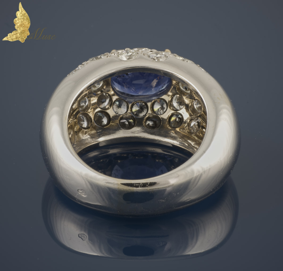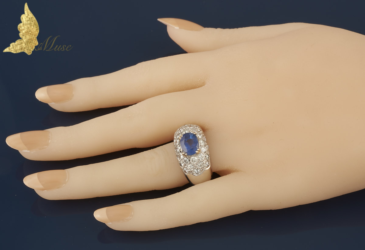 Francuski pierścionek-sygnet z szafirem birmańskim i brylantami w 18K białym złocie