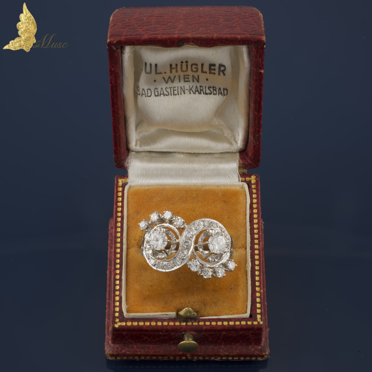 Pierścionek-podwójna korona wykonany z białego złota z podwójną koroną, w której umieszczono jako centralne kamienie 2 diamenty w łącznej masie ok. 0,54 karata. Całą koronę wzbogacają dodatkowo, będąc tłem dla kamieni głównych, 23 diamenty w szlifie 8/8 o łącznej masie około 0,55 karata.